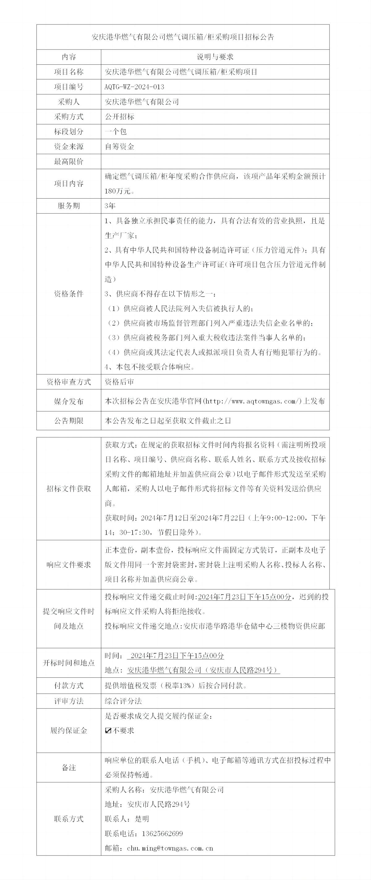 安慶港華燃氣有限公司燃氣調(diào)壓箱/柜采購項目招標公告