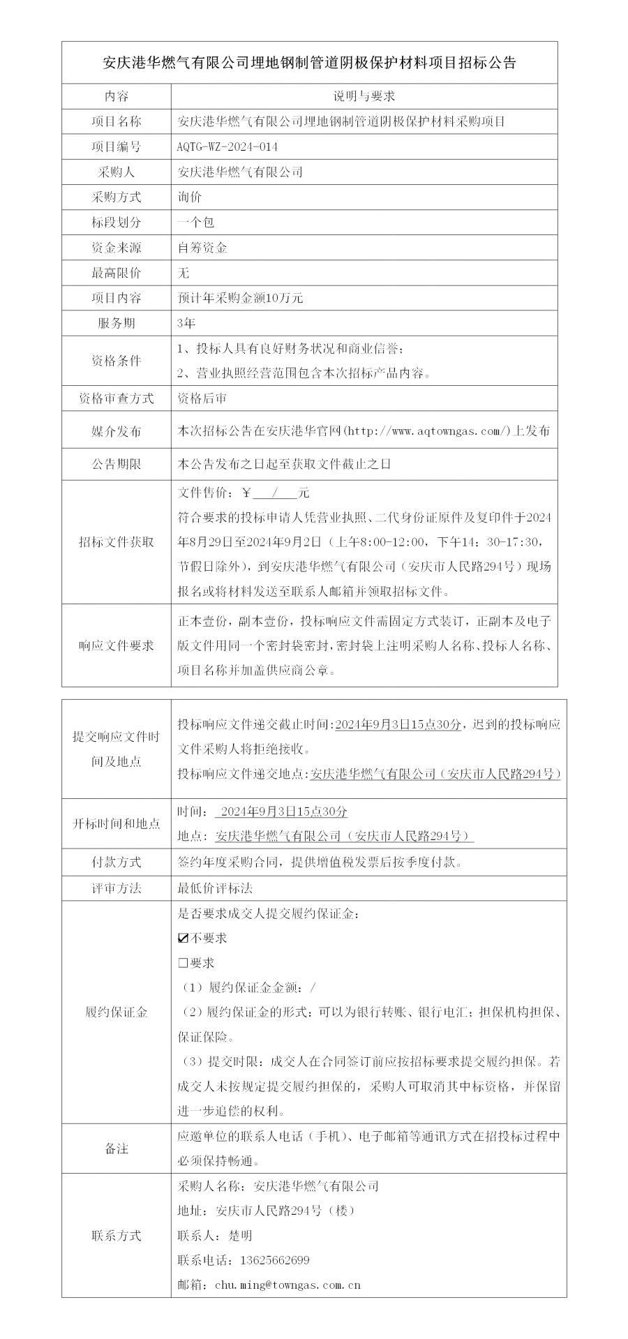 安慶港華燃?xì)庥邢薰韭竦劁撝乒艿狸帢O保護(hù)材料項(xiàng)目招標(biāo)公告
