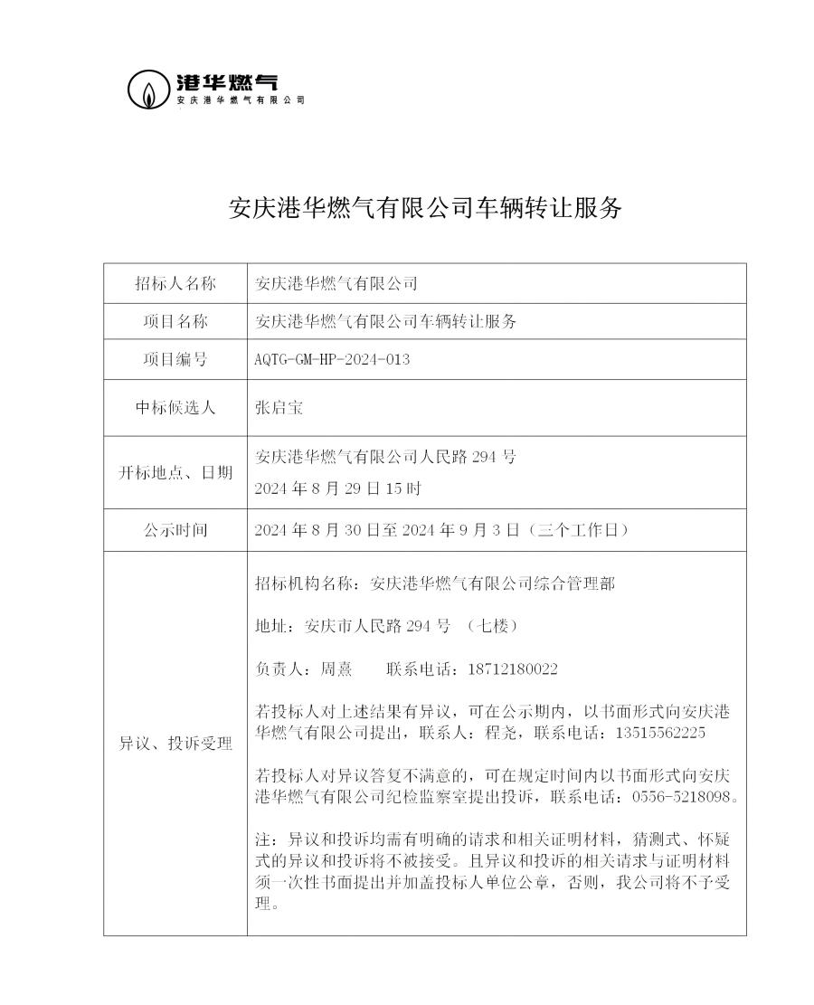 安慶港華燃?xì)庥邢薰拒囕v轉(zhuǎn)讓服務(wù)項目中標(biāo)公示