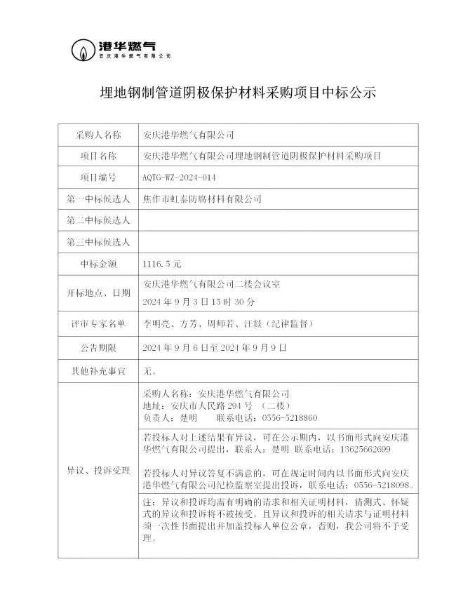 安慶港華燃氣有限公司埋地鋼制管道陰極保護材料采購項目中標公示