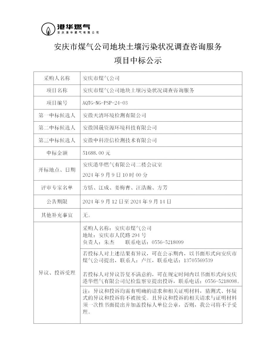 安慶市煤氣公司地塊土壤污染狀況調(diào)查咨詢服務項目中標公示