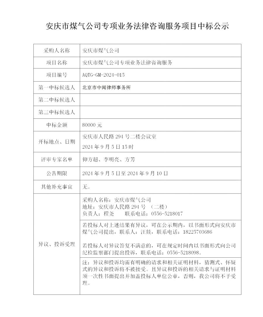 安慶市煤氣公司專項業(yè)務(wù)法律咨詢服務(wù)項目中標(biāo)公示